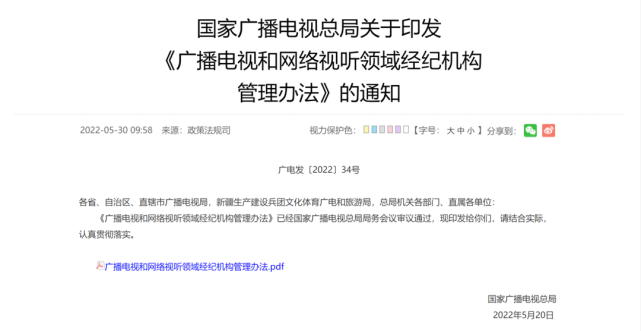 5月30日,國家廣播電視總局印發(fā)了《廣播電視和網(wǎng)絡(luò)視聽領(lǐng)域經(jīng)紀(jì)機(jī)構(gòu)管理辦法》(下稱《辦法》)的通知,并要求各省、自治區(qū)、直轄市廣播電視局,新疆生產(chǎn)建設(shè)兵團(tuán)文化體育廣電和旅游局,總局機(jī)關(guān)各部門、直屬各單位結(jié)合實(shí)際情況,貫徹落實(shí)該管理辦法。