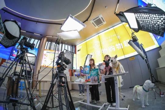 ▲互聯(lián)網(wǎng)營銷師培訓(xùn)機構(gòu)水平參差不齊。圖為浙江省平陽縣寵物小鎮(zhèn)客廳內(nèi),眾多主播直播帶貨。 CFP