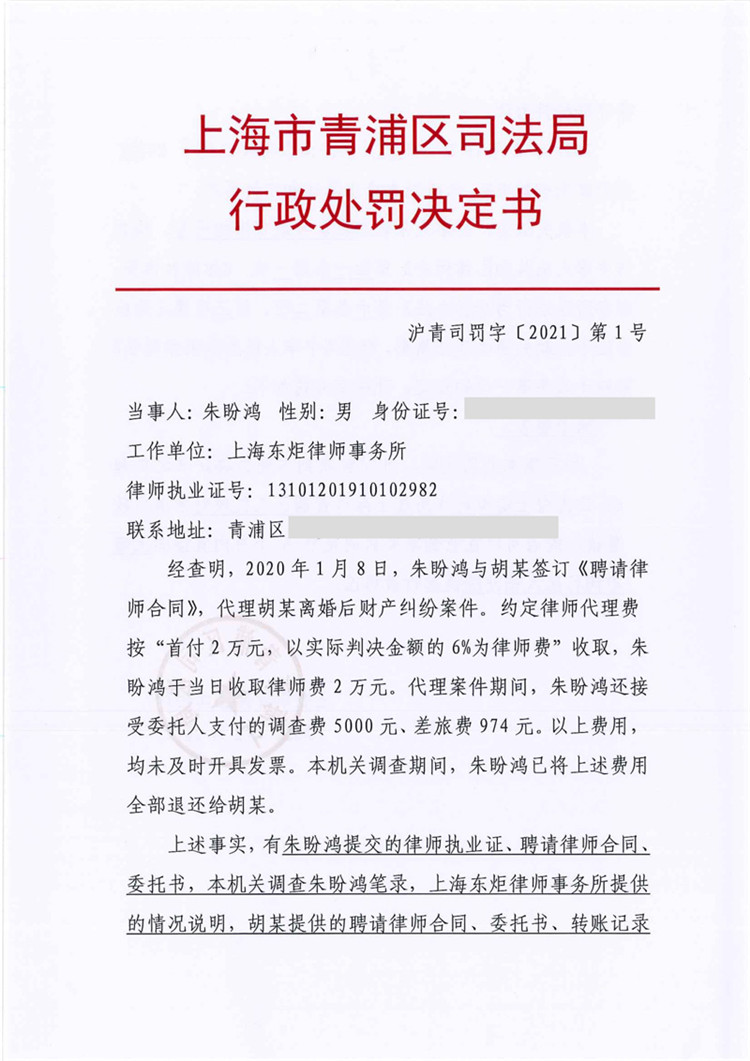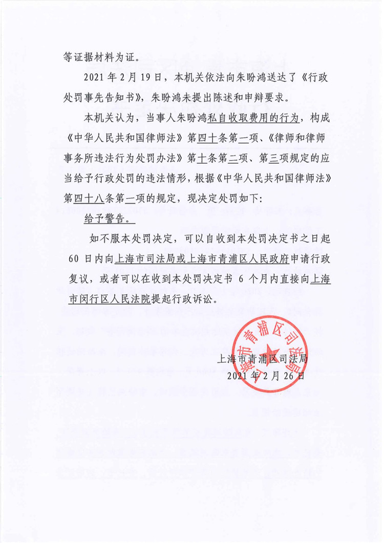 上海律師朱盼鴻因違規(guī)收費(fèi)被處警告