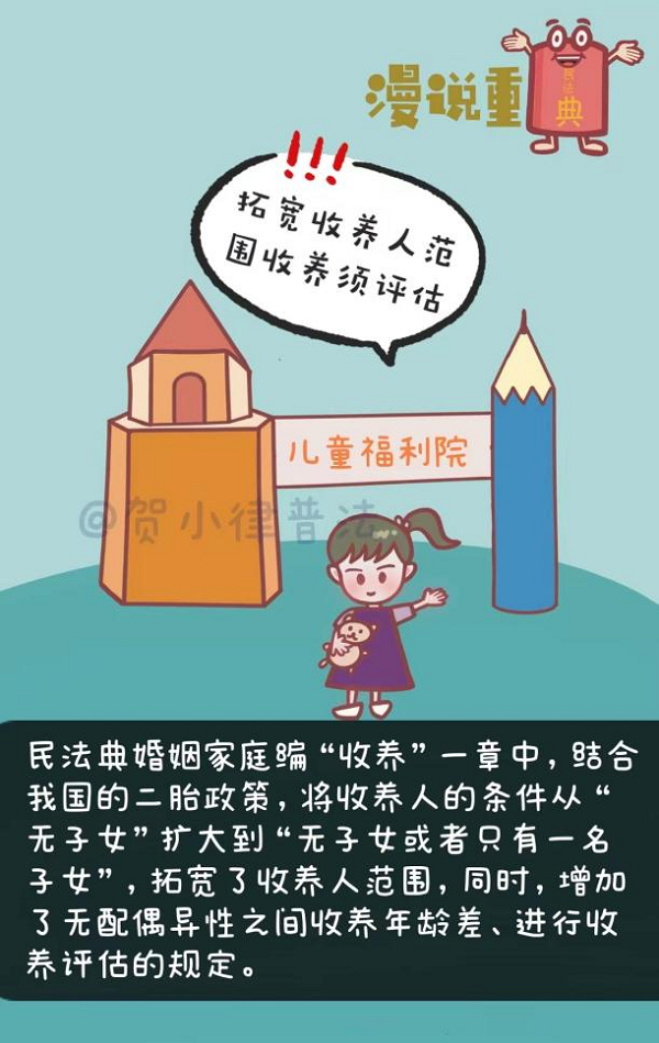 民法典婚姻家庭編“收養(yǎng)”一章中,結(jié)合我國的二胎政策,將收養(yǎng)人的條件從“無子女”擴大到“無子女或者只有一名子女”,拓寬了收養(yǎng)人的范圍,同時,增加了無配偶異性之間收養(yǎng)年齡差、進行收養(yǎng)評估的規(guī)定。