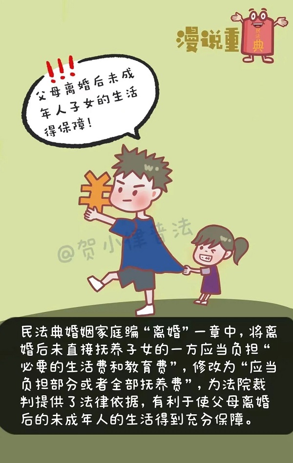 民法典婚姻家庭編“離婚”一章中,將離婚后未直接撫養(yǎng)子女的一方應當負擔“必要的生活費和教育費”,修改為“應當負擔部分或者全部撫養(yǎng)費”,為法院裁判提供了法律依據(jù),有利于使父母離婚后的未成年人的生活得到充分保障。