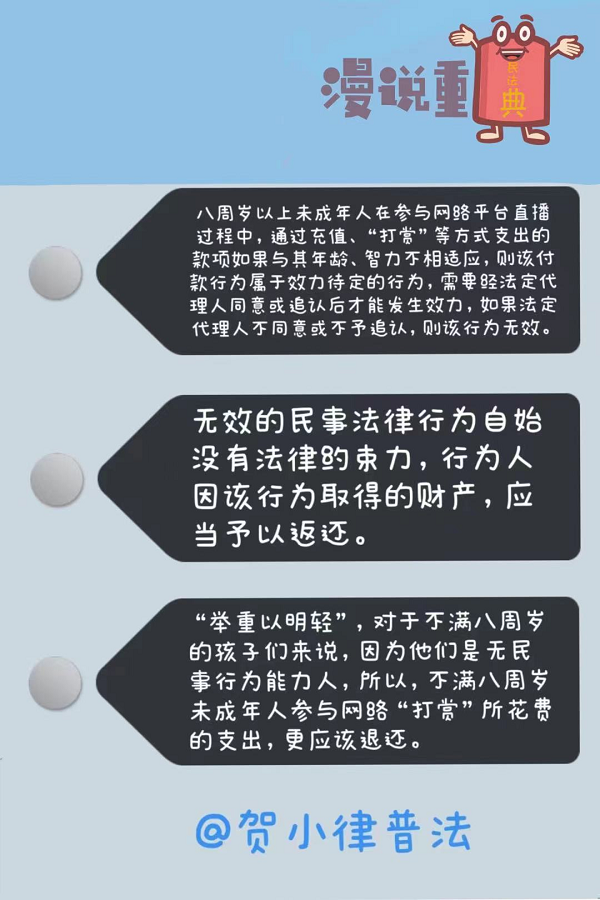 最高人民法院《關(guān)于依法妥善審理涉新冠肺炎疫情民事案件若干問題的指導意見(二)》明確,八周歲以上的未成年人未經(jīng)其監(jiān)護人同意,參與網(wǎng)絡付費游戲或者網(wǎng)絡直播平臺“打賞”等方式支出與其年齡、智力不相適應的款項,監(jiān)護人請求網(wǎng)絡服務提供者返還該款項的,人民法院應予支持。