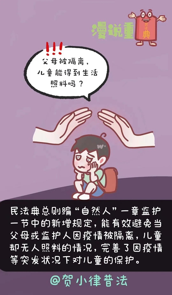 民法典總則編“自然人”一章監(jiān)護一節(jié)中的新增規(guī)定,能有效避免當父母或監(jiān)護人因疫情被隔離,兒童卻無人照料的情況,完善了因疫情等突發(fā)狀況下對兒童的保護。