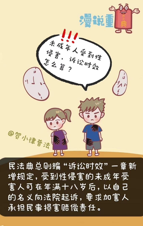 民法典總則編“訴訟時效”一章新增規(guī)定,受到性侵害的未成年人可在年滿十八歲后,以自己的名義向法院起訴,要求加害人承擔民事?lián)p害賠償責任。