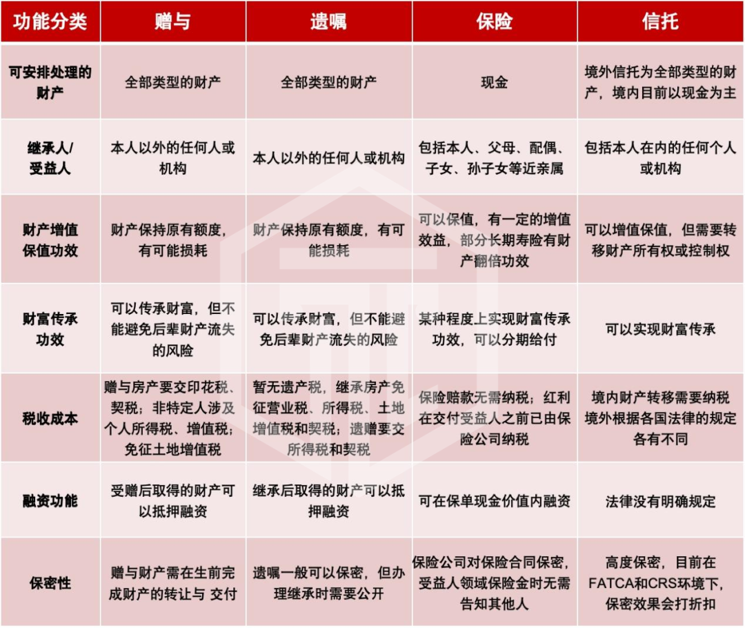 (主要財(cái)富傳承工具對(duì)比)