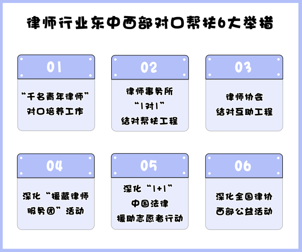 為有效推進律師行業(yè)東中西部對口幫扶工作,《關于建立健全律師行業(yè)東中西部對口幫扶機制的方案》列舉了如下措施。