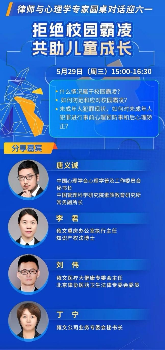 兒童處于個(gè)體發(fā)展的關(guān)鍵階段,是國家的未來和希望。在“六一”兒童節(jié)到來之際,雍文與北大法寶、中國科協(xié)心理應(yīng)急志愿服務(wù)隊(duì)聯(lián)合舉辦律師與心理學(xué)專家圓桌對(duì)話:拒絕校園霸凌 共助兒童成?,用法律與心理學(xué)專業(yè)為未成年人健康成長(zhǎng)保駕護(hù)航。