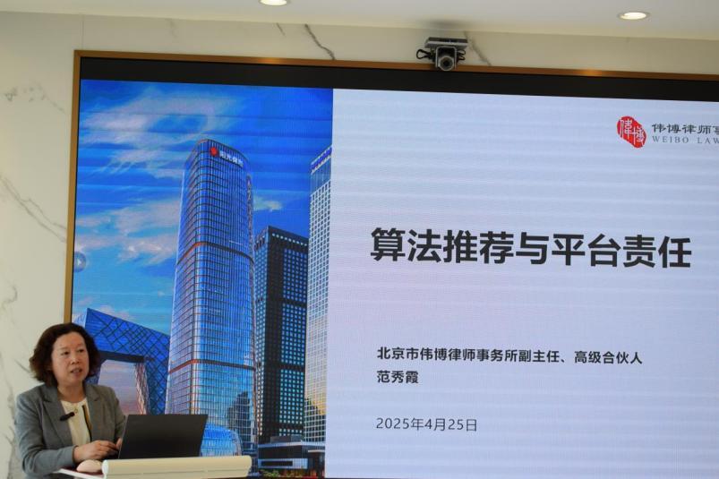 偉博律所副主任范秀霞律師以《算法推薦與平臺(tái)責(zé)任》為題,結(jié)合避風(fēng)港原則、紅旗原則等法律規(guī)定,對算法推薦服務(wù)提供者應(yīng)承擔(dān)的注意義務(wù)點(diǎn)進(jìn)行了提示;結(jié)合司法審判中的具體案例,明確平臺(tái)主動(dòng)審查與被動(dòng)審查的區(qū)別,合理界定了算法推薦服務(wù)者的責(zé)任邊界。范秀霞認(rèn)為,可以通過運(yùn)用技術(shù)手段、完善內(nèi)部制度建設(shè)等方式,實(shí)現(xiàn)平臺(tái)與權(quán)利人的互利共贏,共同營造健康的網(wǎng)絡(luò)內(nèi)容生態(tài)。