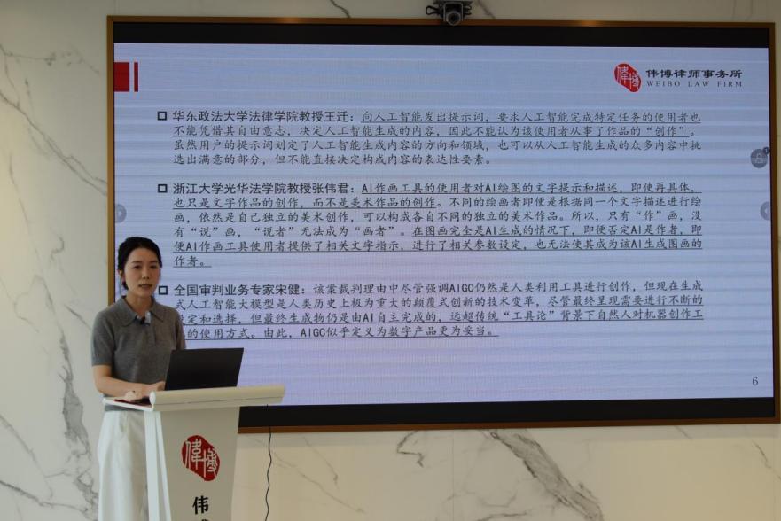 偉博律所律師曹琳娜以《AIGC司法裁判最新動(dòng)向》為題,聚焦行業(yè)前沿,深入分析了近期備受關(guān)注的“春風(fēng)案”和“蝴蝶椅案”背后的核心問題。曹琳娜認(rèn)為,司法實(shí)踐需認(rèn)真審視AI軟件用戶與AI軟件的交互關(guān)系,審慎考量作品性質(zhì),并從法律要件的角度進(jìn)行分析定性,而“蝴蝶椅案”對AIGC產(chǎn)業(yè)的發(fā)展和對AIGC產(chǎn)物的應(yīng)用與保護(hù)作出了有益探索。