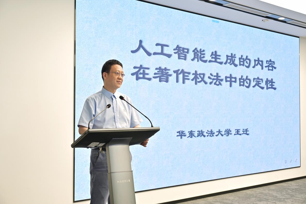 在四個(gè)小時(shí)的課程講解中,王遷教授就其觀點(diǎn)系統(tǒng)梳理了人工智能技術(shù)在內(nèi)容生成、數(shù)據(jù)處理等領(lǐng)域帶來(lái)的著作權(quán)法新挑戰(zhàn)。他圍繞AI生成內(nèi)容的可版權(quán)性認(rèn)定、權(quán)利歸屬、訓(xùn)練數(shù)據(jù)使用的合法性邊界、AI“創(chuàng)作”對(duì)傳統(tǒng)著作權(quán)制度的沖擊與調(diào)適等核心議題,進(jìn)行了鞭辟入里的分析。不僅闡釋了現(xiàn)行法律框架下的理論難點(diǎn),更結(jié)合國(guó)內(nèi)外最新立法動(dòng)態(tài)、司法判例及產(chǎn)業(yè)實(shí)踐,提出了富有洞見(jiàn)的思考方向與可能的解決路徑。