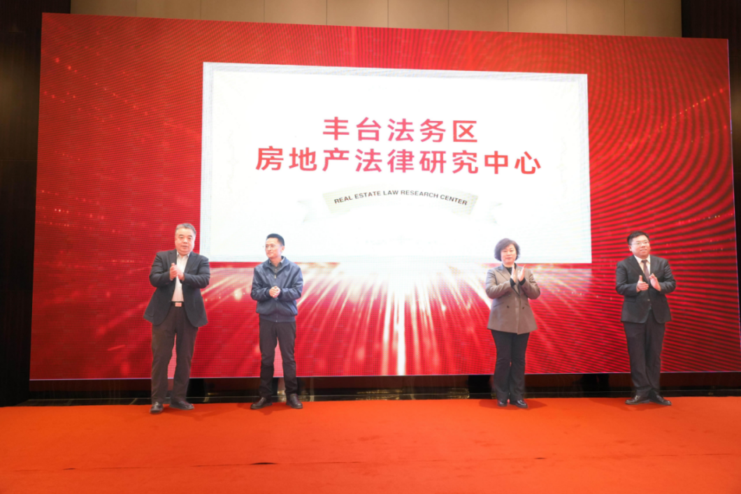 圖為高建忠、曾會(huì)洋、孟憲芹、吳少博為豐臺(tái)法務(wù)區(qū)房地產(chǎn)研究中心揭牌。