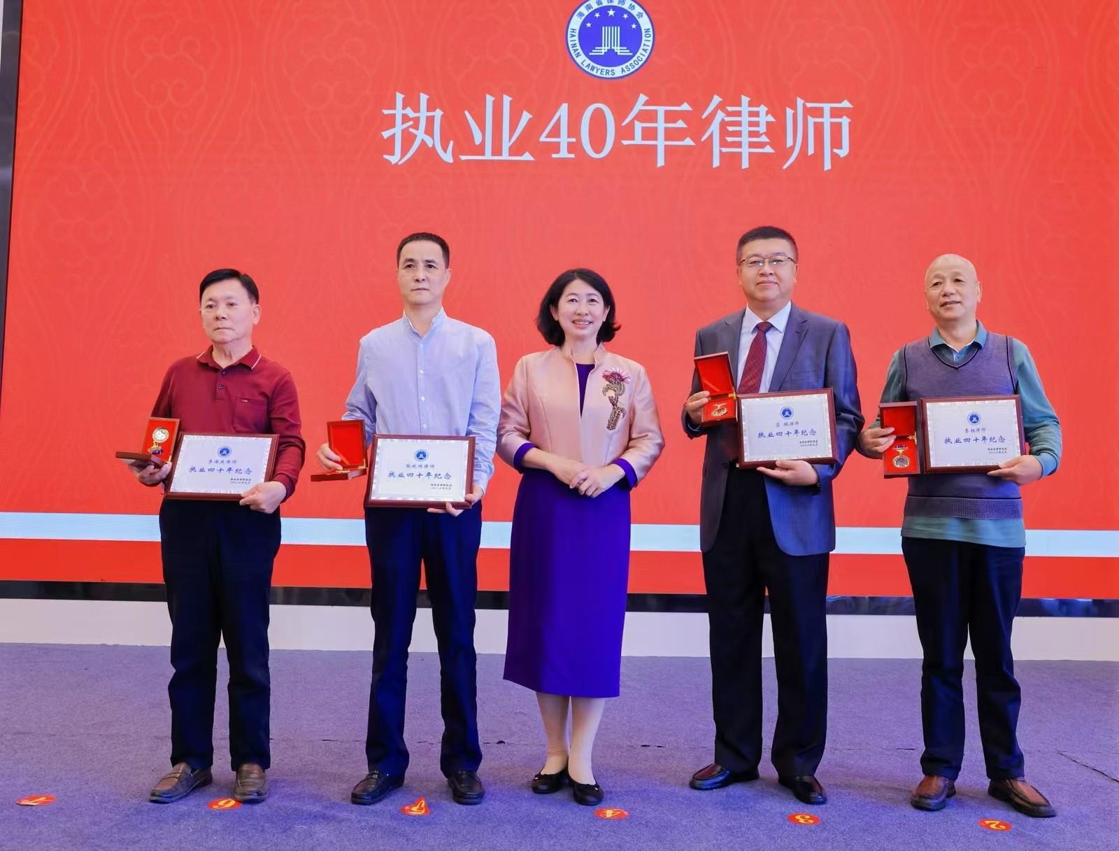 在熱烈的掌聲中,執(zhí)業(yè)滿(mǎn)30年、35年、40年的律師代表以及在律師行業(yè)行政崗位工作滿(mǎn)15年的代表分批上臺(tái),接過(guò)記載執(zhí)業(yè)歷程的紀(jì)念證章和牌匾。他們中,有人兩鬢已生華發(fā),但眼神依然銳利而堅(jiān)定。