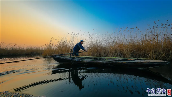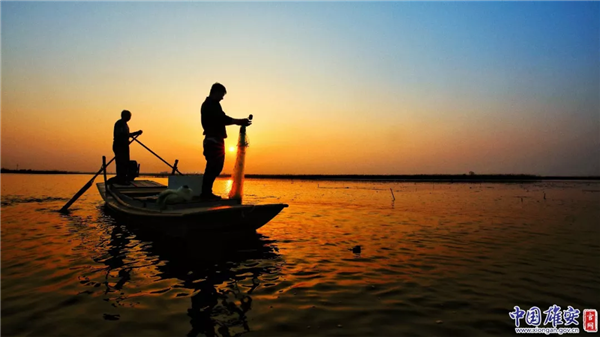 2018年3月25日,晚霞中,白洋淀漁民乘船捕魚。中國雄安官網(wǎng)記者毛鶴然 攝