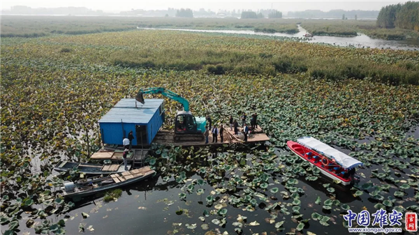 2018年9月,工作人員乘船清除白洋淀安新縣淀內(nèi)水域水產(chǎn)養(yǎng)殖。中國雄安官網(wǎng)記者張斌 攝
