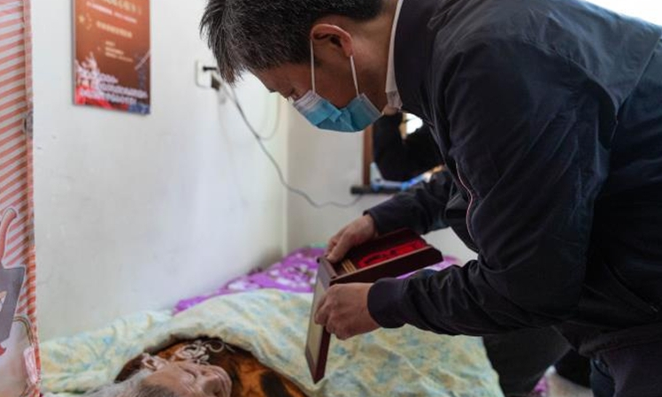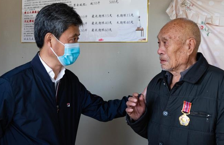 84歲的徐敏老人17歲應(yīng)征入伍,參加過(guò)抗美援朝戰(zhàn)役。他雖然年事已高,但仍然精神抖擻、聲音洪亮。高立春一行來(lái)到徐敏家中,與他親切交談,并送上米、面、油、牛奶等慰問(wèn)品。高立春對(duì)老人投身抗美援朝、經(jīng)歷浴血奮戰(zhàn)的大無(wú)畏精神表示敬意,感謝他們?yōu)樾轮袊?guó)作出的貢獻(xiàn),并親自為他佩戴上“中國(guó)人民志愿軍抗美援朝出國(guó)作戰(zhàn)70周年”紀(jì)念章。同時(shí),高立春還要求相關(guān)部門和工作人員要時(shí)刻關(guān)心、照顧好老人,及時(shí)主動(dòng)地幫助老人解決生活困難,并叮囑老人有任何困難第一時(shí)間找退役軍人服務(wù)中心這個(gè)“娘家人”。