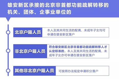 答:除雄安新區(qū)承接的北京籍轉(zhuǎn)移人口、引進(jìn)的人才、原籍雄安新區(qū)的大中專院校學(xué)生、直系親屬投靠且按相關(guān)規(guī)定可在雄安新區(qū)直接辦理落戶的人員外,在雄安新區(qū)合法穩(wěn)定就業(yè)并居住的非雄安新區(qū)戶籍人員,符合本辦法規(guī)定條件申請積分落戶的,適用本辦法。