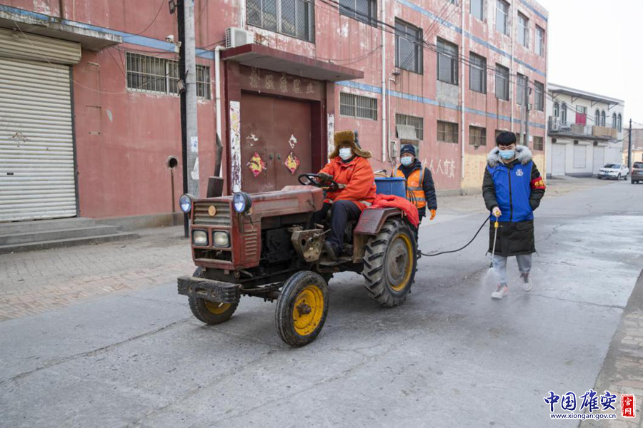 崔公堤村黨支部工作人員對街道進行噴灑消毒。中國雄安官網(wǎng)記者牛思佳 攝