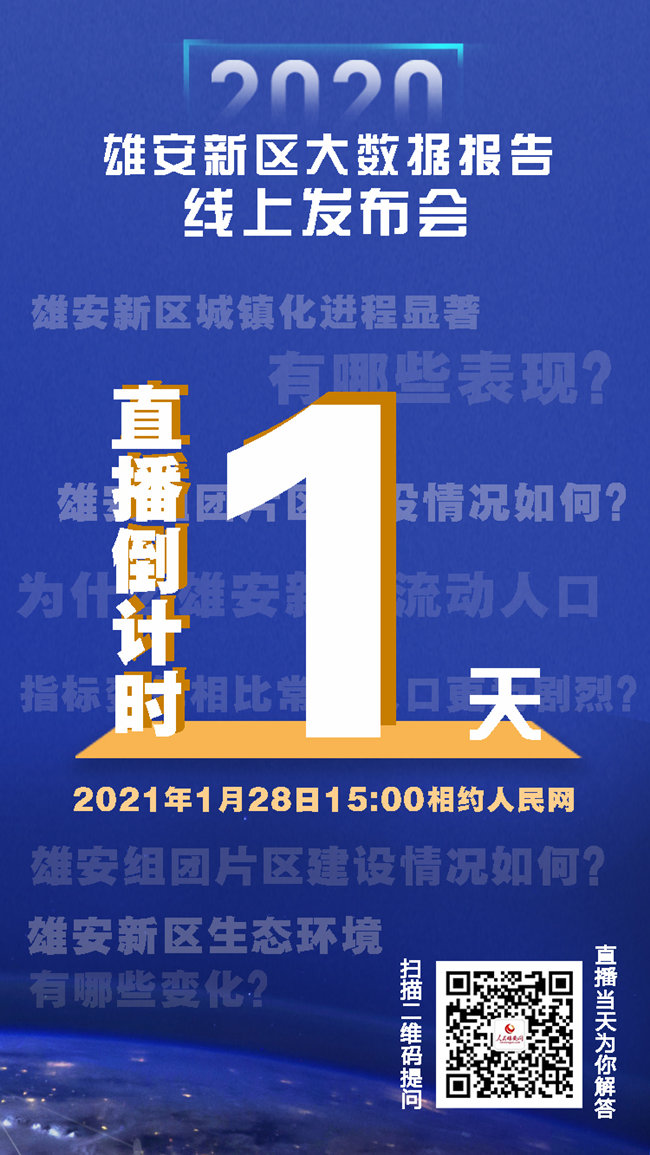 人民網(wǎng)雄安1月27日電 明天,將有關于雄安的重要消息發(fā)布?!拔磥碇?拔節(jié)生長:大數(shù)據(jù)見證雄安之變”雄安新區(qū)2020年大數(shù)據(jù)報告線上發(fā)布會定于28日下午3點,在人民網(wǎng)演播廳舉行。發(fā)布會上,百度商業(yè)智能實驗室專家將重點從生態(tài)環(huán)境變化、基建成果、產業(yè)發(fā)展、人口變化和熱門關注度等角度對雄安新區(qū)2020年大數(shù)據(jù)報告進行解讀,用數(shù)據(jù)幫助你客觀、全面了解雄安新區(qū)過去一年的建設發(fā)展內容和成果。屆時,人民網(wǎng)將全程直播,敬請關注!