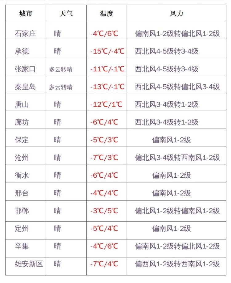 今天早晨,各地最低氣溫全部在-5℃以下,而北部地區(qū)以及滄州,還會(huì)跌破-10℃線。