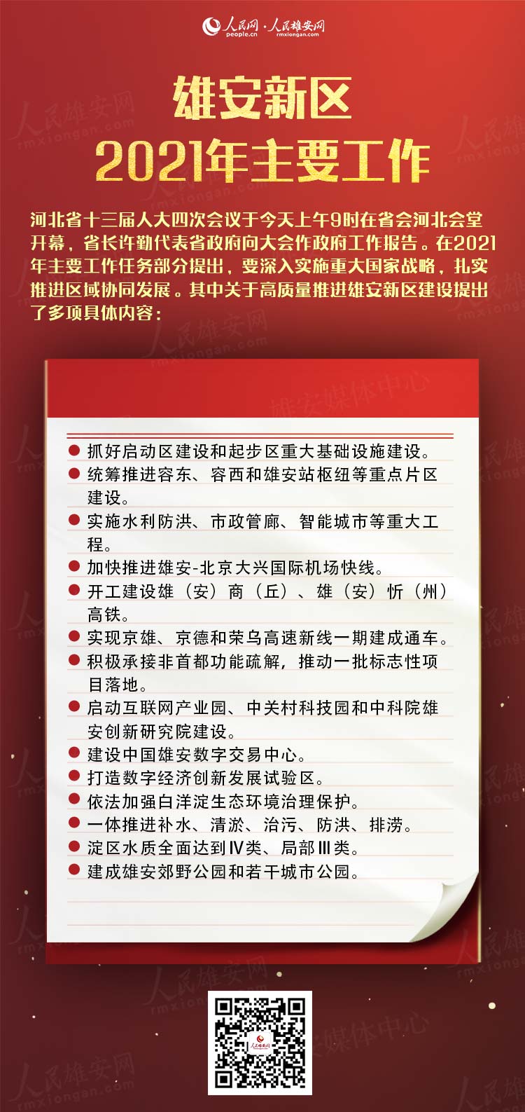 人民網(wǎng)雄安2月19日電(施云娟 竇薇) 河北省十三屆人大四次會(huì)議于今天上午9時(shí)在省會(huì)河北會(huì)堂開幕,河北省長許勤代表省政府向大會(huì)作政府工作報(bào)告。在2021年主要工作任務(wù)部分提出,要深入實(shí)施重大國家戰(zhàn)略,扎實(shí)推進(jìn)區(qū)域協(xié)同發(fā)展。其中關(guān)于高質(zhì)量推進(jìn)雄安新區(qū)建設(shè)提出了多項(xiàng)具體內(nèi)容: