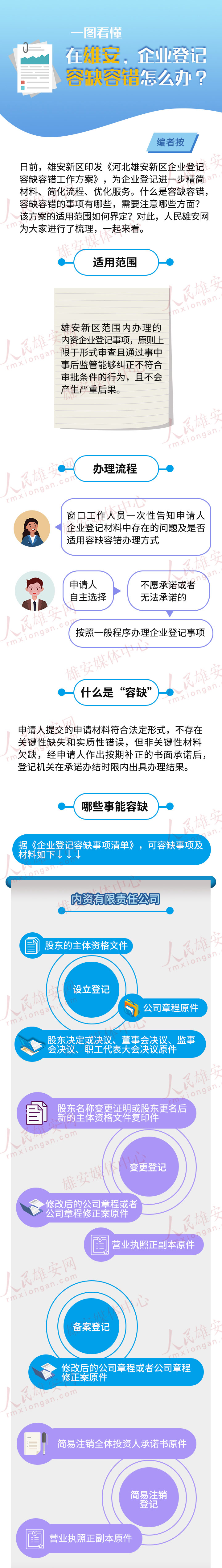 人民網(wǎng)雄安5月25日電 日前,雄安新區(qū)印發(fā)《河北雄安新區(qū)企業(yè)登記容缺容錯(cuò)工作方案》,為企業(yè)登記進(jìn)一步精簡(jiǎn)材料、簡(jiǎn)化流程、優(yōu)化服務(wù)。什么是容缺容錯(cuò),容缺容錯(cuò)的事項(xiàng)有哪些,需要注意哪些方面?該方案的適用范圍如何界定?對(duì)此,人民雄安網(wǎng)為大家進(jìn)行了梳理,一起來(lái)看。