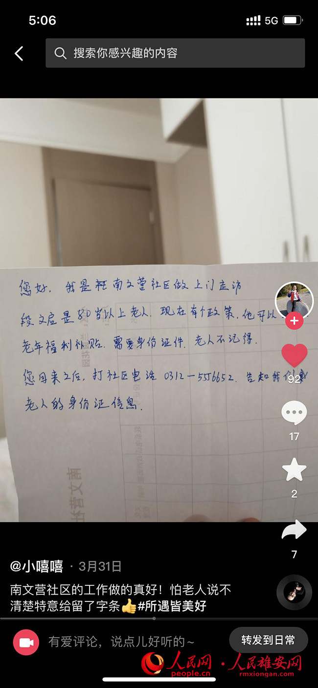 圖為老人家屬將社區(qū)人員留的紙條拍了短視頻發(fā)到網(wǎng)上,獲得一眾好評(píng)。容東管委會(huì)供圖