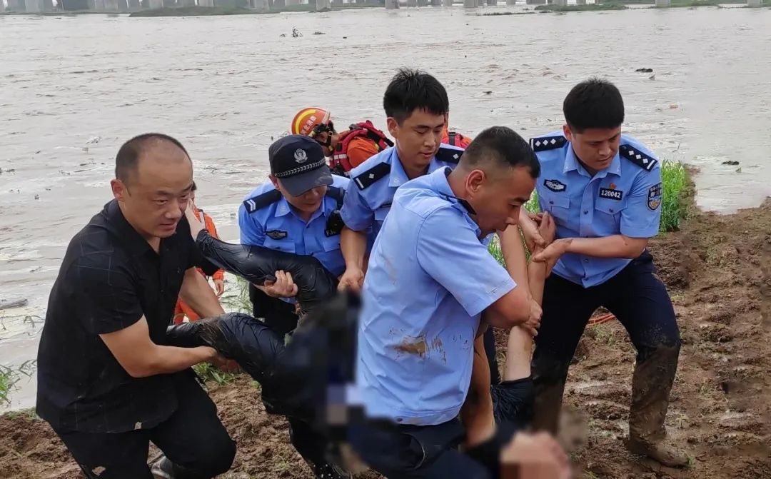 因分洪道周邊土質較軟、道路泥濘,車輛難以通行,時間就是生命,民警來不及猶豫,全部脫掉鞋子光腳踩過50公分深淤泥區(qū)翻越北大堤后到達現(xiàn)場,發(fā)現(xiàn)兩人被困于某項目部南側新蓋房分洪道內(nèi)。
