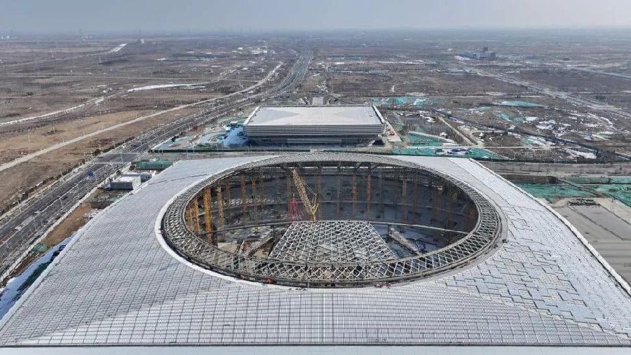 雄安體育中心建設(shè)現(xiàn)場(2月7日攝,無人機(jī)照片)。新華社記者牟宇 攝