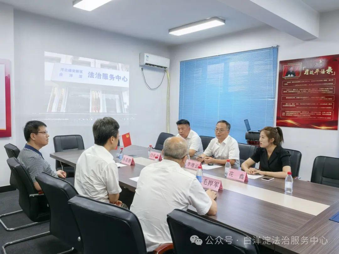 8月20日,河北雄安新區(qū)白洋淀法治服務(wù)中心高級顧問(原司法部全面依法治國研究中心副主任)李富成、新區(qū)黨群工作部副部長孫嘉鵬、雄安新區(qū)政務(wù)服務(wù)中心副主任毛捍軍到中心調(diào)研指導(dǎo)工作。