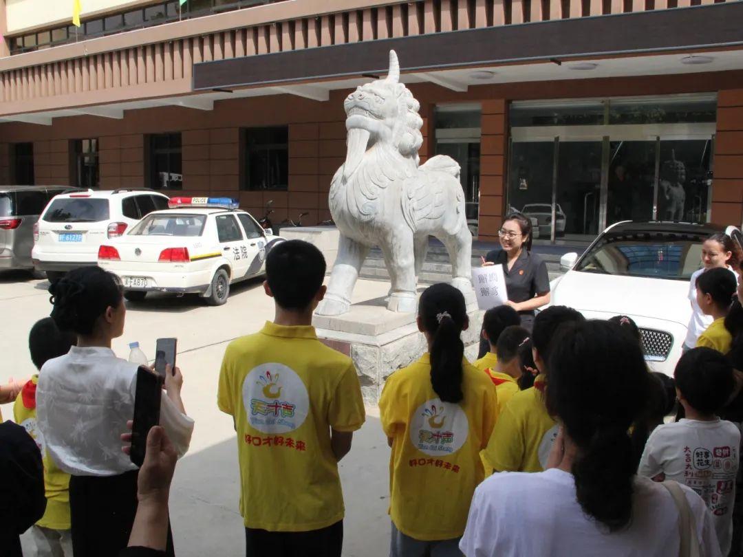 隨后,同學(xué)們來(lái)到法院前院“獬豸”雕像處,干警從“獬豸”的來(lái)源含義到“法”字的演變發(fā)展,生動(dòng)地向同學(xué)們展示了法律的淵源,引發(fā)了同學(xué)們極大的興趣。
