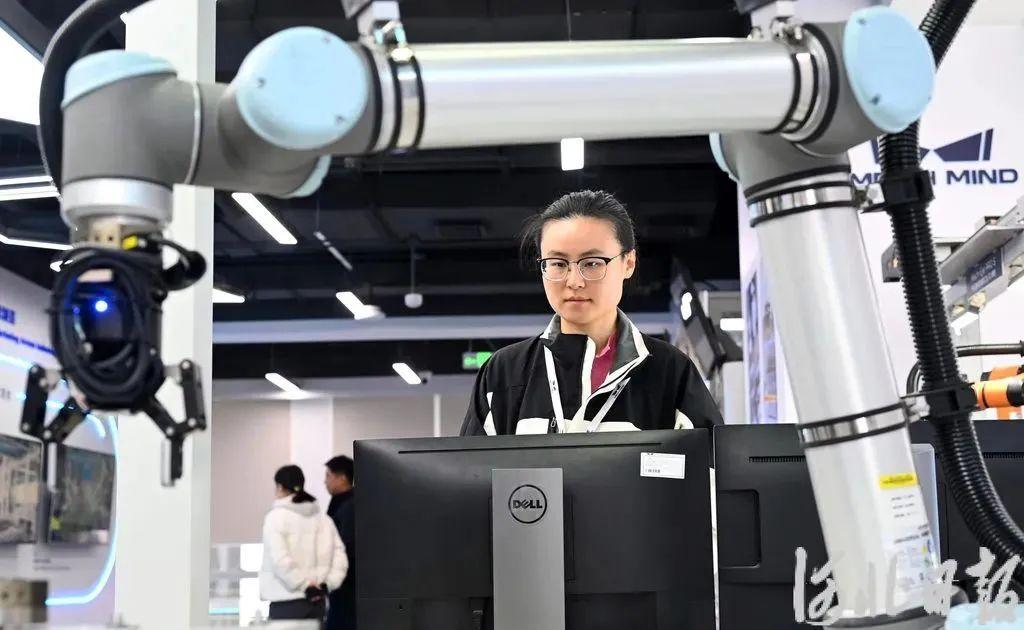 11月28日,雄安新區(qū)中關(guān)村科技園內(nèi),梅卡曼德工作人員為參觀者演示“AI+機(jī)器人”新產(chǎn)品。河北日?qǐng)?bào)記者劉光昱 攝