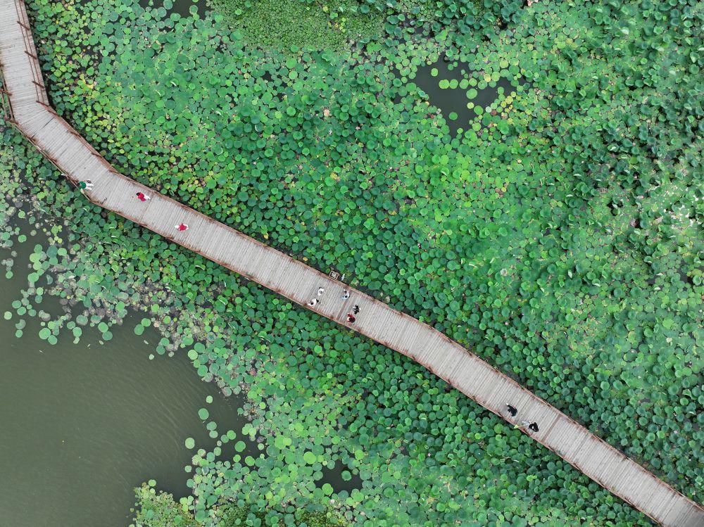 游人在雄安新區(qū)白洋淀荷花大觀園內(nèi)游覽(2024年7月9日攝,無人機照片)。新華社記者 牟宇 攝