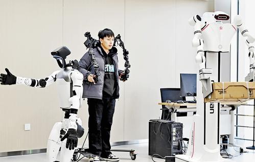 近日,在中國雄安集團(tuán)數(shù)字城市科技有限公司的具身智能訓(xùn)練場內(nèi),數(shù)據(jù)采集員正對異構(gòu)機(jī)器人進(jìn)行具身智能訓(xùn)練。記者劉光昱 攝