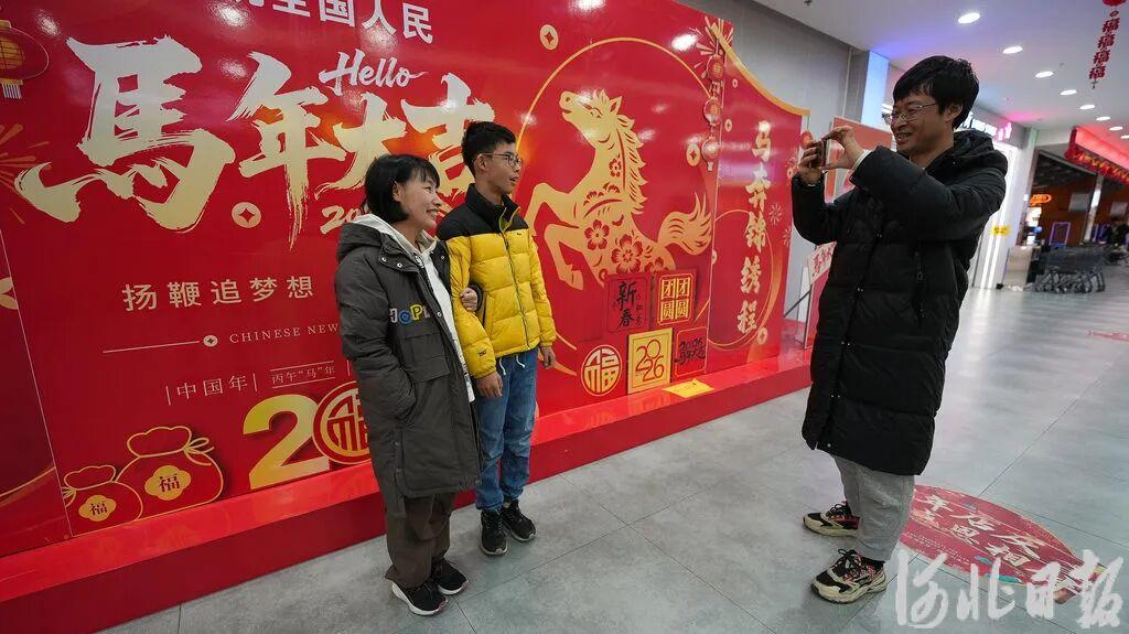 2月6日,竇則勝和家人在雄安奧特萊斯新年背景墻前拍照打卡。河北日報見習(xí)記者李暢攝