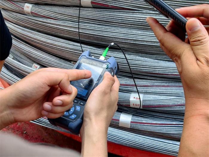 由于智慧纜索光纖成分是二氧化硅,安裝過程精度要求高,施工過程中,六安8標(biāo)現(xiàn)場管理人員和工人聚精會神、精準(zhǔn)調(diào)度,嚴(yán)格控制牽引速度,排查各工序?qū)鈻殴饫w的保護(hù)措施。6日16時許,智慧纜索成功拉通入鞍后順利通過功能檢測。