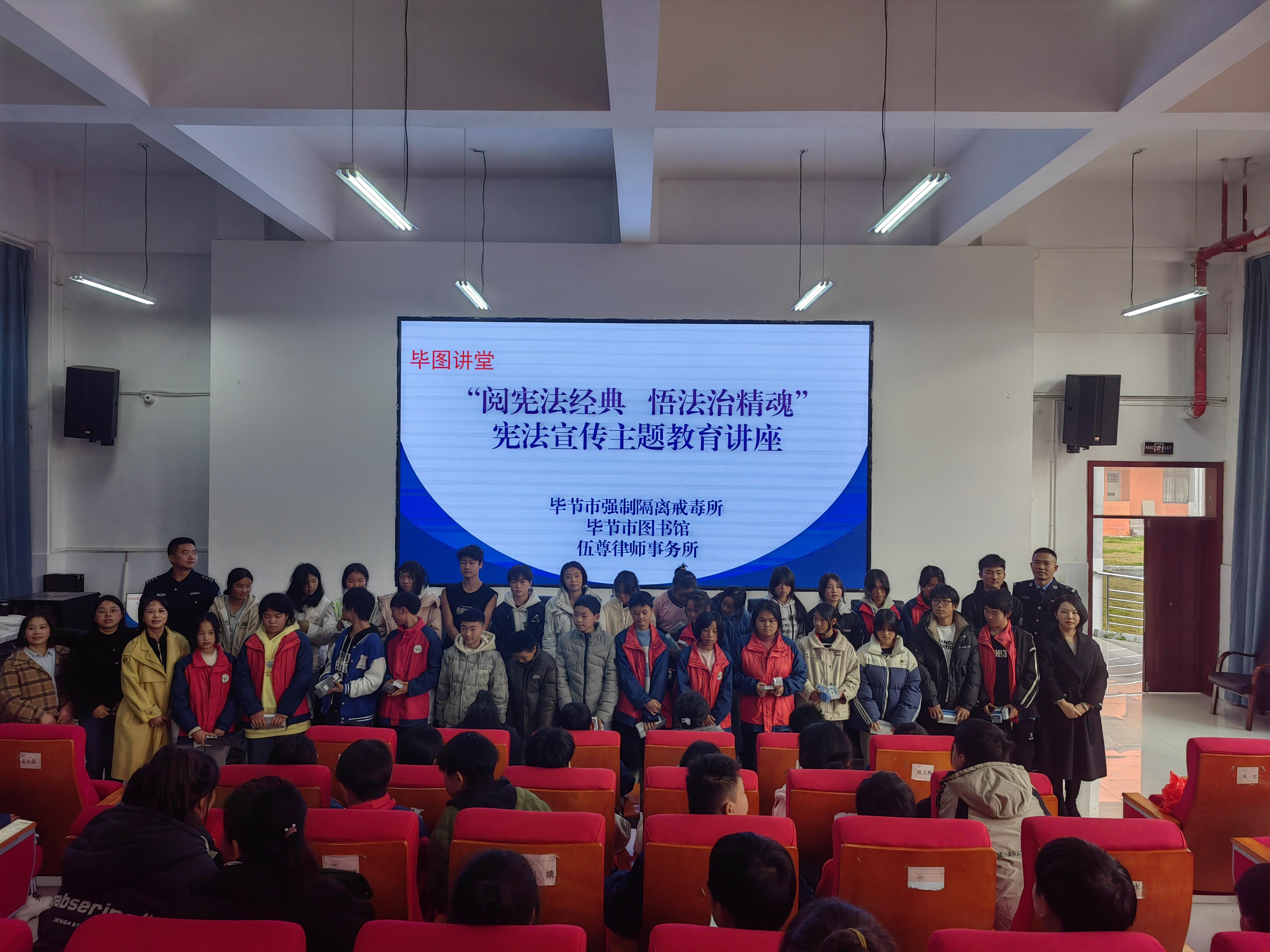 活動中,畢節(jié)市律師協(xié)會公益法律服務(wù)和社會責(zé)任委員會為同學(xué)們開展憲法知識講座。伍尊律師事務(wù)所律師結(jié)合實(shí)際案例,深入淺出地講解了憲法的基本內(nèi)容、重要地位以及與青少年日常生活息息相關(guān)的法律條款。從公民的基本權(quán)利與義務(wù)到國家機(jī)構(gòu)的組織架構(gòu),從受教育權(quán)的保障到未成年人的特殊保護(hù),同學(xué)們聽得津津有味,不時舉手提問。畢節(jié)強(qiáng)制隔離戒毒所宣講民警還向同學(xué)們介紹了毒品的種類、危害以及如何預(yù)防毒品侵害等知識。