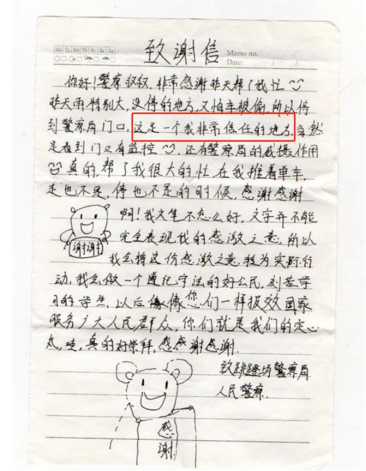 感謝信中,女孩用真摯而稚嫩的語言表達(dá)了對(duì)派出所民輔警的感激之情“這是一個(gè)我非常信任的地方?!敝赡鄣墓P跡讓全所民輔警動(dòng)容,信中附著的手繪插畫,雖然簡單卻充滿了童真和感激。