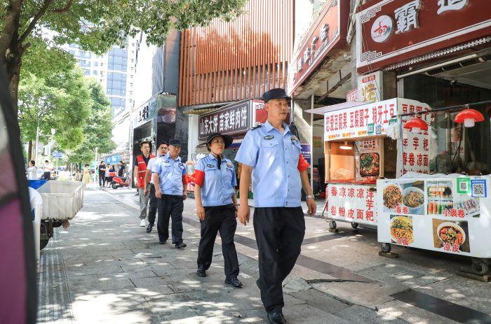 夜幕降臨,數(shù)公里外的紅街夜市人聲鼎沸,金紅社區(qū)“紅袖標志愿巡邏隊”隊員王成正穿梭于攤位間,仔細檢查商戶的煤氣罐閥門和電路線路?!凹t街夜市有600余家商戶,夜間食客多,醉酒糾紛、噪音擾民、用電用氣安全都是重點?!弊鳛閰R昌物業(yè)秩序隊長、巡邏隊“元老”,王成對夜市安全隱患了如指掌。