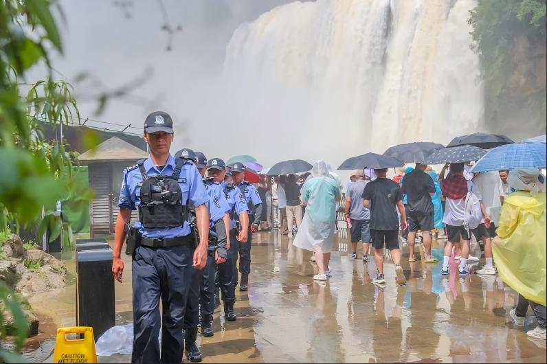 而這樣的瞬間,在年均接待游客580萬人次的世界級(jí)景區(qū)黃果樹瀑布每天都在上演,景區(qū)治安派出所的6名民警和53名輔警以“景警融合”的模式,守護(hù)著115平方公里的景區(qū)安全,成為一道獨(dú)特而亮麗的風(fēng)景線。