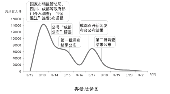 3月14日10時(shí)許,微信公眾號“成都發(fā)布”刊發(fā)文章《這些謠言信不得!》,盤點(diǎn)了警民沖突、家長跳樓、家長臥底等流傳甚廣的六大謠言。隨后,中國網(wǎng)、鳳凰網(wǎng)、四川在線等多家媒體轉(zhuǎn)載,對遏制網(wǎng)絡(luò)謠言起到?jīng)Q定性作用。相關(guān)部門回應(yīng)后,公眾討論逐步回歸食品安全本身,輿情呈現(xiàn)降溫跡象。