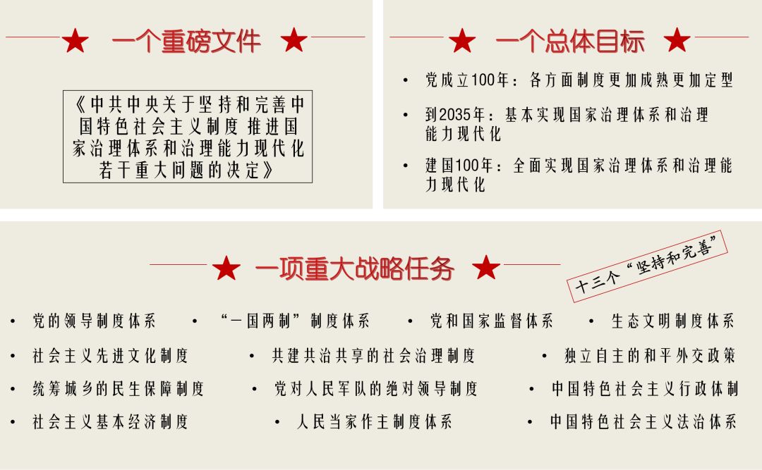 10月28日至10月31日,中國(guó)共產(chǎn)黨第十九屆中央委員會(huì)第四次全體會(huì)議在北京召開(kāi)。會(huì)議審議通過(guò)了《中共中央關(guān)于堅(jiān)持和完善中國(guó)特色社會(huì)主義制度、推進(jìn)國(guó)家治理體系和治理能力現(xiàn)代化若干重大問(wèn)題的決定》(以下簡(jiǎn)稱(chēng)《決定》)。10月31日,四中全會(huì)《公報(bào)》發(fā)布;11月5日,《決定》全文發(fā)布。