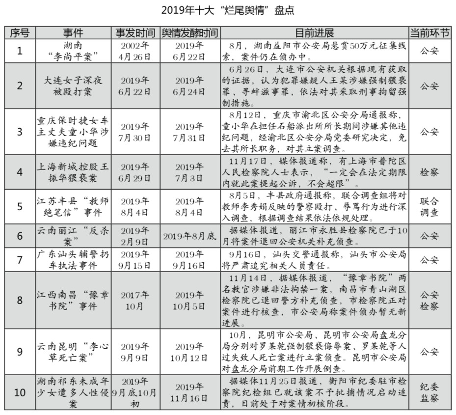 編者按:今年的網(wǎng)絡(luò)輿論場并不平靜,多起涉政法事件引爆輿論場,并發(fā)酵成為全網(wǎng)關(guān)注的熱點輿情,引發(fā)輿論震動。如備受輿論矚目的孫小果案、鄧世平案,從曝光之日起,就牽動著無數(shù)輿論目光。近日,相關(guān)涉案人員陸續(xù)受審獲刑,背后的“保護傘”也被立案調(diào)查。這類重大輿情事件不“爛尾”,體現(xiàn)出各級政法機關(guān)依法履行職責的自覺和擔當,值得稱道。然而也需看到,2019年接近尾聲,仍有不少輿情事件沒有掃尾,輿論場還遺留大量問號等待拉直。近年來,政法網(wǎng)絡(luò)輿情回應(yīng)率穩(wěn)步提升的前提下,輿情事件的處置完結(jié)率卻忽高忽低,2019年上半年不到六成事件有最終結(jié)果,遠低于2018年全年75%的比率。鑒于此,法制網(wǎng)輿情中心(ID:fzwyqzx)盤點這一年的重大政法輿情事件,梳理出那些長時間沒有進展和結(jié)果的“爛尾輿情”,并通過分析其類型、總結(jié)其特征、剖析其危害,提出規(guī)避與應(yīng)對的建議,以供有關(guān)部門參考借鑒。