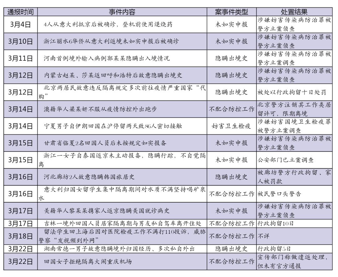當(dāng)前,國內(nèi)疫情防控形勢持續(xù)向好,海外疫情卻在加速蔓延,一些境外人員和海外留學(xué)生選擇回國避疫,“外防輸入”成現(xiàn)階段疫情防控工作的重中之重。在此關(guān)鍵時(shí)期,少數(shù)人員采取各種手段隱瞞出境史或隱瞞病情,不遵守防疫、隔離等規(guī)定,妨害疫情防控秩序,給我國的疫情防控工作帶來巨大壓力,引發(fā)輿論高度關(guān)注。法制網(wǎng)輿情中心(ID:fzwyqzx)選取3月以來熱度較高的16起個(gè)案,簡要分析其類型和處置結(jié)果,梳理輿論觀點(diǎn),并就后續(xù)處置提出應(yīng)對建議。