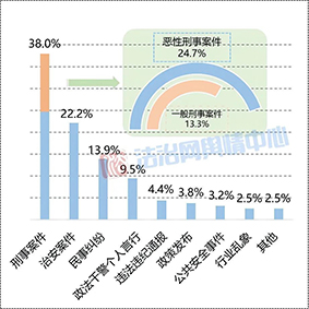 涉法輿情事件158起,占比95.2%。由刑事案件引發(fā)的輿情占比最高,達(dá)38.0%,其中惡性刑事案件占比24.7%,一般刑事案件占比13.3%。治安案件、民事糾紛、違紀(jì)違法通報(bào)引發(fā)的輿情分別占比22.2%、13.9%、4.4%。民事糾紛中,涉及婚姻問(wèn)題尤其離婚的案事件同比較多,如福建連城縣法院發(fā)出首張“離婚冷靜期通知書(shū)”、湖南女子5年4次起訴離婚均被駁回、全國(guó)首例家庭勞務(wù)補(bǔ)償案宣判等。政策發(fā)布、公共安全事件引發(fā)的輿情分別占比3.8%、3.2%。此外,教育等行業(yè)亂象波及政法機(jī)關(guān)的輿情占比2.5%,其他輿情事件占比2.5%。