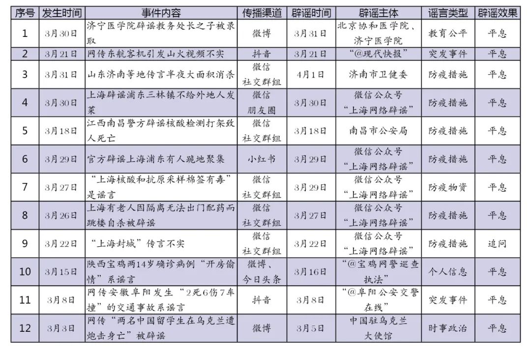 3月網(wǎng)絡(luò)涉法謠言辟謠榜單共梳理、匯總12起熱點(diǎn)事件,圍繞謠言持續(xù)時(shí)間、傳播渠道、產(chǎn)生地域、類(lèi)型以及辟謠平臺(tái)等維度綜合分析,篩選兩起關(guān)注度較高、具有典型意義的案例研判,以期為網(wǎng)絡(luò)辟謠工作提供參考借鑒。