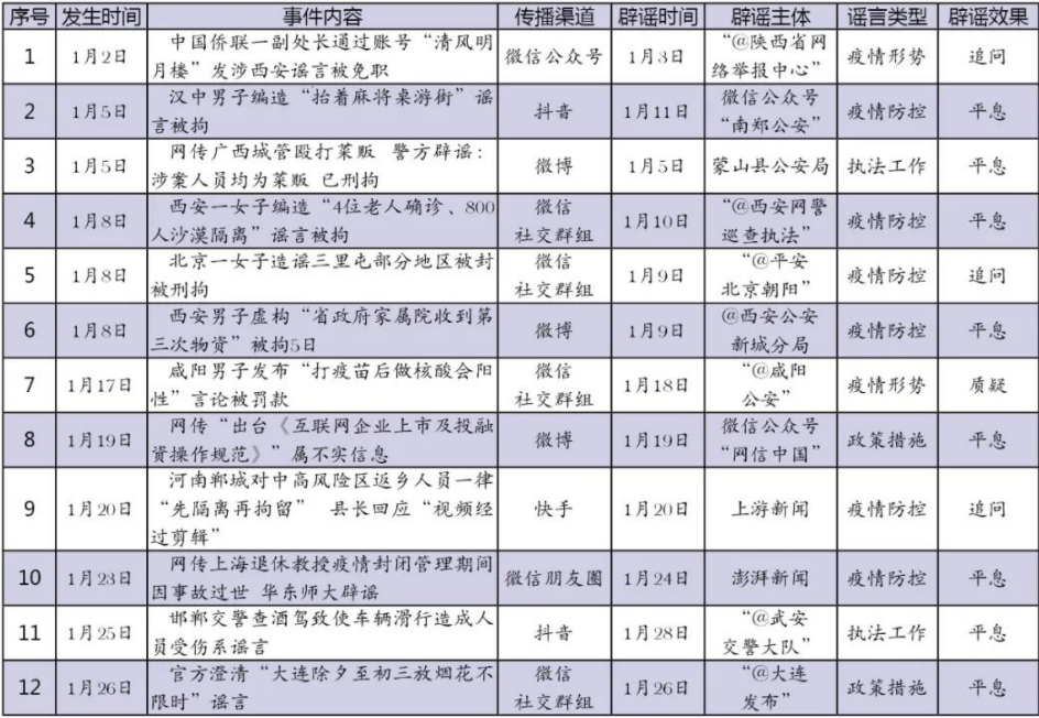 1月網(wǎng)絡(luò)涉法謠言辟謠榜單共梳理、匯總12起熱點(diǎn)事件,圍繞謠言持續(xù)時(shí)間、傳播渠道、產(chǎn)生地域、類(lèi)型以及辟謠平臺(tái)等維度綜合分析,并篩選兩起關(guān)注度較高、具有典型意義的案例研判,以期為網(wǎng)絡(luò)辟謠工作提供參考借鑒。
