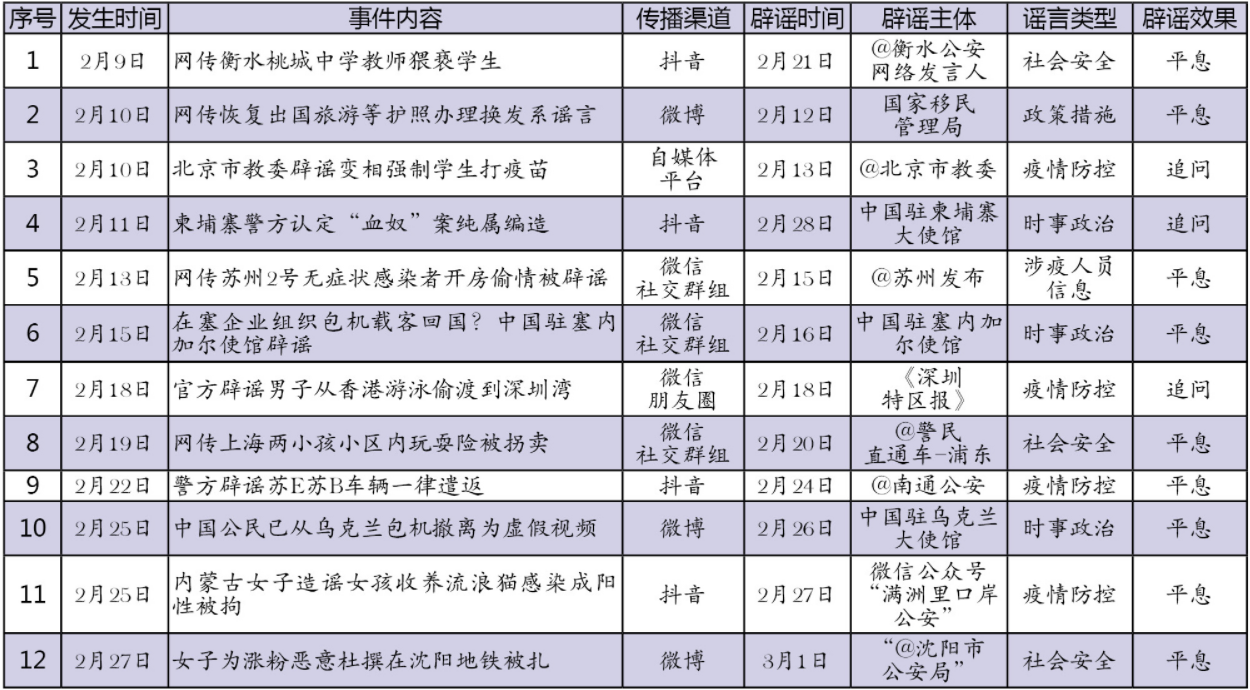2月網(wǎng)絡(luò)涉法謠言辟謠榜單共梳理、匯總12起熱點(diǎn)事件,圍繞謠言持續(xù)時(shí)間、傳播渠道、產(chǎn)生地域、類(lèi)型以及辟謠主題等維度綜合分析。法治網(wǎng)輿情中心從中篩選兩起關(guān)注度較高、具有典型意義的案例研判,以期為網(wǎng)絡(luò)辟謠工作提供參考借鑒。