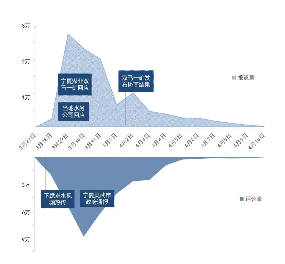 3月29日,部分中央主流媒體發(fā)聲表態(tài):“@中國新聞網(wǎng)”稱“‘缺水’的輿論場需要真相甘霖”;央廣網(wǎng)推出文章《萬畝治沙林被煤礦“斷水”?供水和調(diào)查必須馬上到位》,指出當(dāng)?shù)乇仨毐M快用客觀公正的調(diào)查還原真相,給林場主一個交代,給萬畝林場一個交代,也給公眾一個交代。輿論場還曝光一份判決書,顯示寧夏回族自治區(qū)銀川市中院曾作出判決,明確該煤礦占用林地,要求賠償孫國友727.54萬元。另據(jù)九派新聞報道,當(dāng)?shù)厮畡?wù)公司負(fù)責(zé)人稱,礦場污水處理達標(biāo),但是水的鹽分過高澆不了樹。煤礦一方稱,污水處理設(shè)備容量比較小,每天只能處理兩千立方,且資金成本太大,不想加大投入。靈武市政府相關(guān)人員向媒體表示,正在針對此事協(xié)調(diào)處理。當(dāng)日,“#萬畝樹木被煤礦斷水面臨枯死#”“#水務(wù)公司回應(yīng)萬畝林場主跪地求供水#”等相關(guān)微博話題沖上熱搜榜前列,輿情熱度達到峰值。部分網(wǎng)民表示,經(jīng)歷了沙塵暴,才能真正明白造林治沙的好處和難處,“不能讓好人流汗流淚又流血”。微博大V“@胡錫進”也呼吁,希望不用下跪崩潰引起巨大輿情也能正常解決。
