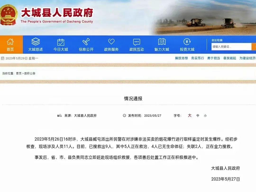5月26日下午,網(wǎng)傳河北大城縣一派出所院內(nèi)發(fā)生爆炸,事故原因引發(fā)網(wǎng)民追問(wèn)。5月27日8時(shí)許,大城縣人民政府網(wǎng)站通報(bào)稱:“5月26日16時(shí)許,大城縣臧屯派出所民警在對(duì)涉嫌非法買(mǎi)賣的煙花爆竹進(jìn)行取樣鑒定時(shí)發(fā)生爆炸。經(jīng)初步核查,現(xiàn)場(chǎng)涉及人員11人。其中,4人已無(wú)生命體征,失聯(lián)2人。”然而,通報(bào)中提及的爆炸原因卻成為后續(xù)輿情發(fā)酵點(diǎn),網(wǎng)民不解派出所民警為何要去鑒定煙花爆竹,部分網(wǎng)民借機(jī)對(duì)死去民警進(jìn)行冷嘲熱諷,發(fā)布揣測(cè)性信息,并獲得其他網(wǎng)民點(diǎn)贊。面對(duì)這種局面,當(dāng)?shù)卣⑽催M(jìn)行回應(yīng)和解釋,認(rèn)證為“河北省公安廳政治部副主任”的賬號(hào)“@永華的小菜園”批評(píng)當(dāng)?shù)氐男畔l(fā)布“語(yǔ)焉不詳導(dǎo)致誤讀”。