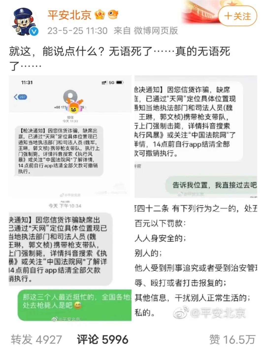 近日,多名網(wǎng)民曬出圖片稱收到“強(qiáng)制槍斃”詐騙短信,引發(fā)一小波關(guān)注。5月25日11時(shí)許,北京市公安局官方微博“@平安北京”發(fā)布一則為幾張?jiān)p騙短信截圖的微博,圖片內(nèi)容相同皆寫(xiě)著:“因您信貸詐騙,缺席出庭,已通過(guò)‘天網(wǎng)’定位具體位置,現(xiàn)已通知當(dāng)?shù)貓?zhí)法部門(mén)和司法人員(魏軍,王琳,郭文禎)攜帶槍支帶隊(duì),執(zhí)行上門(mén)強(qiáng)制槍斃,詳情抖音搜索《執(zhí)行風(fēng)暴》或關(guān)注‘中國(guó)法院網(wǎng)’了解詳情,14點(diǎn)前自行app結(jié)清全部欠款可撤銷執(zhí)行?!睂?duì)此,“@平安北京”直言道“就這,能說(shuō)點(diǎn)什么?真的無(wú)語(yǔ)死了”。隨后,還配了治安管理處罰法的截圖,指出發(fā)短信恐嚇?biāo)怂媾R的處罰。該則微博迅速引發(fā)大量網(wǎng)民圍觀,相關(guān)微博轉(zhuǎn)評(píng)超過(guò)1.1萬(wàn)次,點(diǎn)贊16.5萬(wàn)次。多數(shù)網(wǎng)民表示騙子侮辱人智商,并留言調(diào)侃稱“笑死,現(xiàn)在槍決都能上門(mén)服務(wù)了”“這三個(gè)人挺忙,全國(guó)各地到處去槍斃人”。